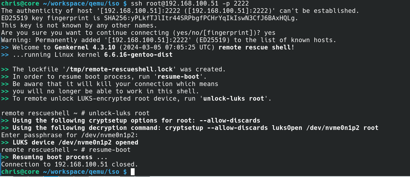 crypt_root后续跟着的是luks所在的分区UUID,注意不是解锁之后的UUIDdosshd在initramfs中启动一个sshd守护进程root解锁之后root所在的位置ip这里使用dhcp分配对应的ipgk.sshd.port=2222sshd守护进程的端口init=/lib/systemd/systemdsystemd init的配置net.ifnames=0网卡都遵循类似etch0, eth1这样的格式